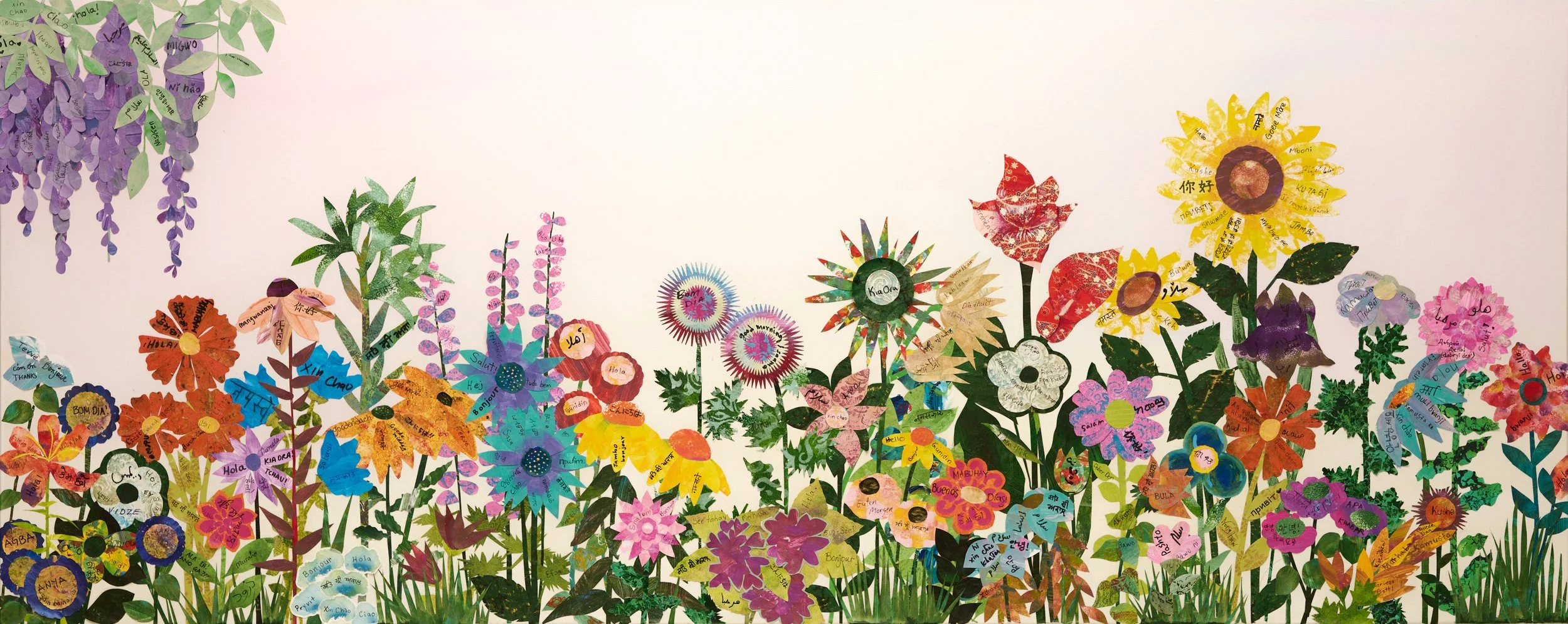 With over 118 languages spoken in Abbotsford, the "Abbotsford Says Hello" project aimed to include and recognize the rich diversity of our community. Children painted on sheets of paper, which I cut into petals, leaves and stems. Children and adults were then invited to write "hello" in their native language.